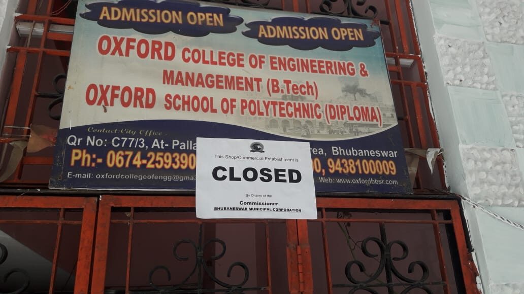 କୋଭିଡ କଟକଣା ଉଲଂଘନ କରି ସିଲ୍ ହୋଇଛି ରାଜଧାନୀ ର ଘରୋଇ ମ୍ୟାନେଜମେଣ୍ଟ କଲେଜ୍। ପଳାଶପଲ୍ଲୀ ସ୍ଥିତ ଅକ୍ସଫୋର୍ଡ କଲେଜକୁ ସିଲ୍ କରିଛି ବି ଏମ ସି।