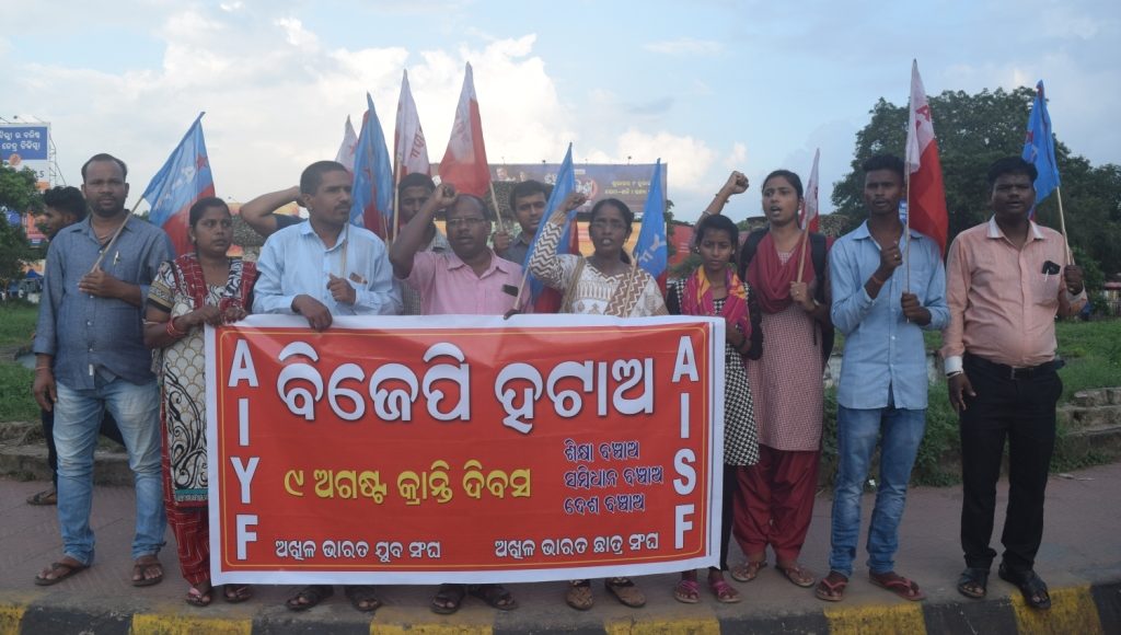 ତେଣୁ ଅଗଷ୍ଟ ୯ କ୍ରାନ୍ତି ଦିବସରେ ଅଖିଳ ଭାରତ ଛାତ୍ରସଂଘ ଓ ଅଖିଳ ଭାରତ ଯୁବସଂଘ ପକ୍ଷରୁ ମିଳିତ ଭାବରେ ସର୍ବଭାରତୀୟ “ଶିକ୍ଷା ବଂଚାଅ-ଦେଶ ବଂଚାଅ” ଡାକରା ଦିଆଯାଇଥିଲା।ୟୁଜିସି ବଂଚାଇବା,ଖାଲିପଡିଥିବା ୫୦ଲକ୍ଷ ପଦବୀ ପୂରଣ,BNEGA ଆଇନକୁ କାର୍ଯ୍ୟକାରୀ କରିବା,ଭିଡତନ୍ତ୍ରକୁ ବନ୍ଦ କରିବା,ଦୁଷ୍କର୍ମ ଓ ଯୌନ ନିର୍ଯାତନା ବନ୍ଦ କରିବା ଦାବିରେ ,ଭୁବନେଶ୍ୱର ଠାରେ AISF-AIYF ଦ୍ୱାରା ପ୍ରତିବାଦ ସଭା ଅନୁଷ୍ଠିତ ହୋଇଥିଲା।ଏହି ପ୍ରତିବାଦରେ AISFର ପବିତ୍ର ସ୍ୱାଇଁ,ଅବିନାଶ ନାୟକ,ସଙ୍ଘମିତ୍ରା ଜେନା,ରିଙ୍କି ବେହେରା ଓ AIYFର ସୁଭାଶିନୀ ଭଦ୍ର,ଗୋହିଗୋବିନ୍ଦ ବେଶ୍ରା,ନାରାୟଣ ଡାଳୁଆ,ବିଶ୍ୱଜିତ୍ ନାୟକ,ସୁରେଶ ମୁଦୁଲି,ବିକ୍ରମ କୁମାର ପ୍ରମୁଖ ନେତୃତ୍ୱ ନେଇଥିଲେ।