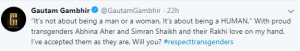 ମୁମ୍ବାଇ:କିନ୍ନରମାନଙ୍କ ପାଖରୁ ରାକ୍ଷୀ ବାନ୍ଧି ମାନବିକତାର ଏକ ବଡ ଉଦାହରଣ ଦେଇଛନ୍ତି ଭାରତୀୟ କ୍ରିକେଟର ଗୌତମ ଗମ୍ଭୀର୍। ଏହା ସହିତ ସମସ୍ତ ଦେଶବାସୀଙ୍କୁ ଭାଇ-ଭଉଣୀଙ୍କର ଏହି ପବିତ୍ର ପର୍ବରେ ଏକ ଭଲ ସନ୍ଦେଶ ଦେଇଛନ୍ତି ।ଦୁଇ କିନ୍ନର ଅବିନା ଅହର ଓ ସିମରନ ଶେଖଙ୍କୁ ନିଜର ନୂଆ ଭଉଣୀ କରିବା ପରେ ସେମାନେ ଗମ୍ଭୀରଙ୍କୁ ରାକ୍ଷୀ ବାନ୍ଧିଥିଲେ । ଯାହାର ଫଟୋକୁ ସୋସିଆଲ ମିଡିଆରେ ସେୟାର କରିଛନ୍ତି ଗମ୍ଭୀର । ଯେଉଁଥିରେ ଅବିନା ଏବଂ ସିମରନ୍ ମଧ୍ୟ ରହିଛନ୍ତି । ଗମ୍ଭୀର ଫୋଟ ସେୟାର କରିବା ସହିତ ମନକୁ ଛୁଇଁଲା ଭଳି ଗୋଟେ କ୍ୟାପସନ ମଧ୍ୟ ଲେଖିଛନ୍ତି ।