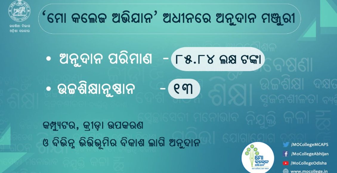‘ମୋ କଲେଜ’ ଅଭିଯାନ ଅଧୀନରେ ୧୩ଟି ମହାବିଦ୍ୟାଳୟ ପାଇଁ ୮୫ ଲକ୍ଷ ଟଙ୍କାର ପ୍ରକଳ୍ପକୁ ମଞ୍ଜୁରୀ