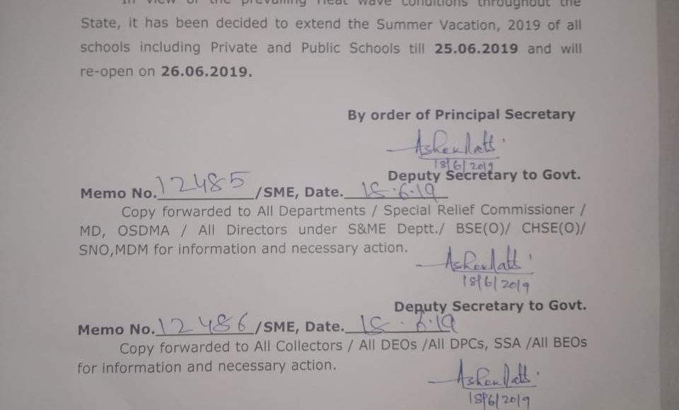 ଆସନ୍ତା ୨୫ ତାରିଖ ଯାଏଁ ବଢିଲା ଖରାଛୁଟି ।ରାଜ୍ୟର ସମସ୍ତ ସ୍କୁଲ ଆସନ୍ତା ୨୫ ତାରିଖ ଯାଏଁ ଛୁଟି ରହିବ ଓ ୨୬ ତାରିଖରେ ଖୋଲିବ । ଏନେଇ ସୂଚନା ଦେଇଛନ୍ତି ସ୍କୁଲ ଓ ଗଣଶିକ୍ଷା ସଚିବ ପ୍ରଦୀପ୍ତ ମହାପାତ୍ର । ପ୍ରବଳ ଗ୍ରୀଷ୍ମପ୍ରବାହକୁ ଦୃଷ୍ଟିରେ ରଖି ସରକାରଙ୍କ ପକ୍ଷରୁ ଏଭଳି ନିଷ୍ପତ୍ତିି ନିଆଯାଇଛି । ଜୁନ୍ ୨୫ ତାରିଖ ଯାଏଁ ଖରାଛୁଟିକୁ ବୃଦ୍ଧି କରାଯାଇଥିବା ସ୍ପଷ୍ଟ କରିଛନ୍ତି ସରକାର ।